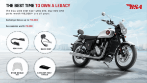 23 ઑગસ્ટથી 23 સપ્ટેમ્બર, 2025 સુધી આ એક્સચેન્જ પ્રોગ્રામ ચાલશે.રૂ.5,896ના મૂલ્યની ખાસ રીતે તૈયાર કરવામાં આવેલી એસેસરી કિટની સાથેલાભનું કુલ મૂલ્ય રૂ.15,896 થવા જાયછે, જે વર્ષ 1861થી વર્લ્ડ મોટરસાઇકલિંગનો હિસ્સો રહેલી બીએસએના ખ્યાતનામ વારસાને અનુરૂપ રહીને એનિવર્સરી નિમિત્તે જાહેર કરવામાં આવેલોલાભ છે.