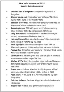 દરમિયાન, 2025 માં, બાકીનું ભારત ફક્ત ખરીદી જ નહોતું કરી રહ્યું; તે ઇન્સ્ટામાર્ટ સાથે રોજિંદા જીવનમાં સુધારો કરી રહ્યું હતું. દૂધ દેશની નંબર 1 આવશ્યક વસ્તુ તરીકે ઉભરી આવ્યું, ભારત દર સેકન્ડે 4 થી વધુ પેકેટ દૂધનો ઓર્ડર આપતું હતું; 26,000 ઓલિમ્પિક કદના પૂલ ભરવા માટે પૂરતું દૂધ. ભારતે પણ મોટી ખરીદી કરી, હૈદરાબાદના એક વપરાશકર્તાએ ₹4.3 લાખની કિંમતની વર્ષની સૌથી મોટી કાર્ટનો ઓર્ડર આપ્યો, જેમાં ત્રણ iPhone 17 પ્રોનો સમાવેશ થાય છે.