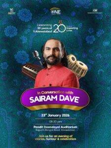 ગુજરાત, અમદાવાદ | ૧૯મી જાન્યુઆરી ૨૦૨૬ — યુવા નેતૃત્વને પ્રોત્સાહન આપવાના બે દાયકાની ઉજવણી તરીકે યંગ ઇન્ડિયન્સ (Yi) અમદાવાદ પ્રસિદ્ધ હાસ્યકાર અને વાર્તાકાર સાંઈરામ દવે સાથે એક વિશેષ સાંજનું આયોજન કરશે. આ કાર્યક્રમ શુક્રવાર, ૨૩ જાન્યુઆરીના રોજ પંડિત દીનદયાળ ઓડિટોરિયમ ખાતે યોજાશે.